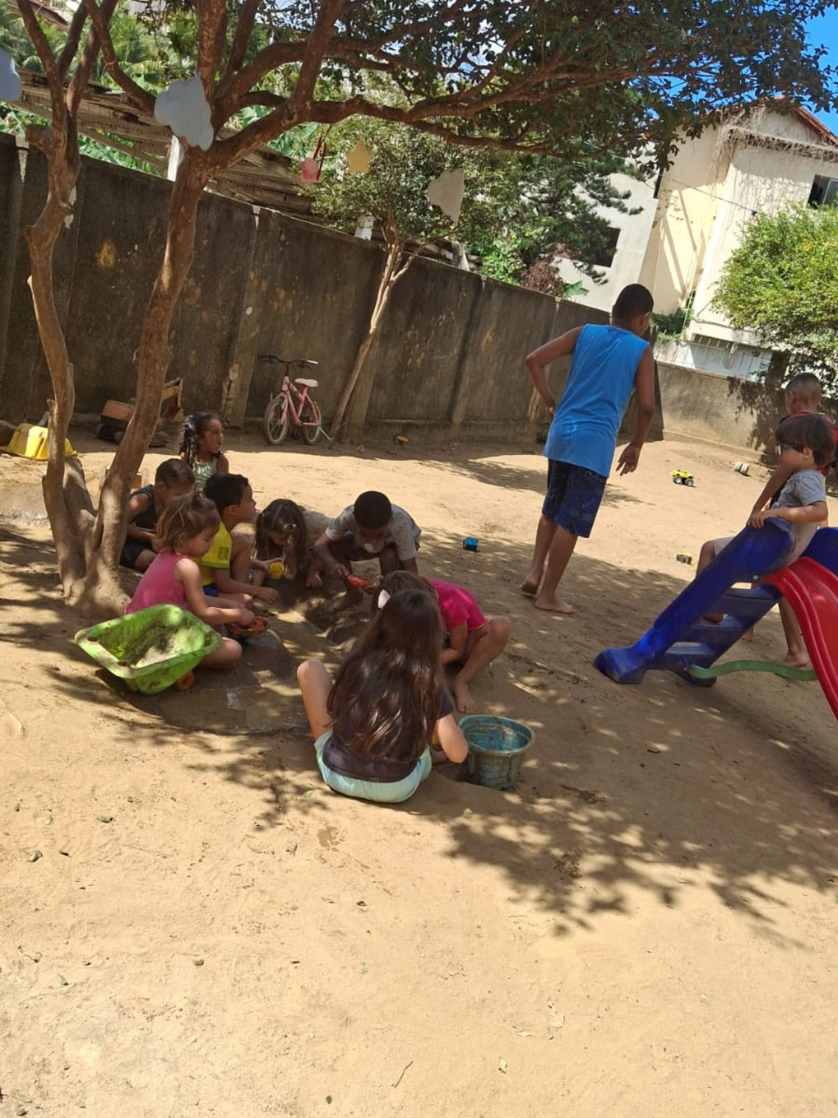 Aqui as crianças têm a oportunidade de explorar, sentir a terra, plantar e colher. Brincadeiras que conectam o mundo real com o meio ambiente.